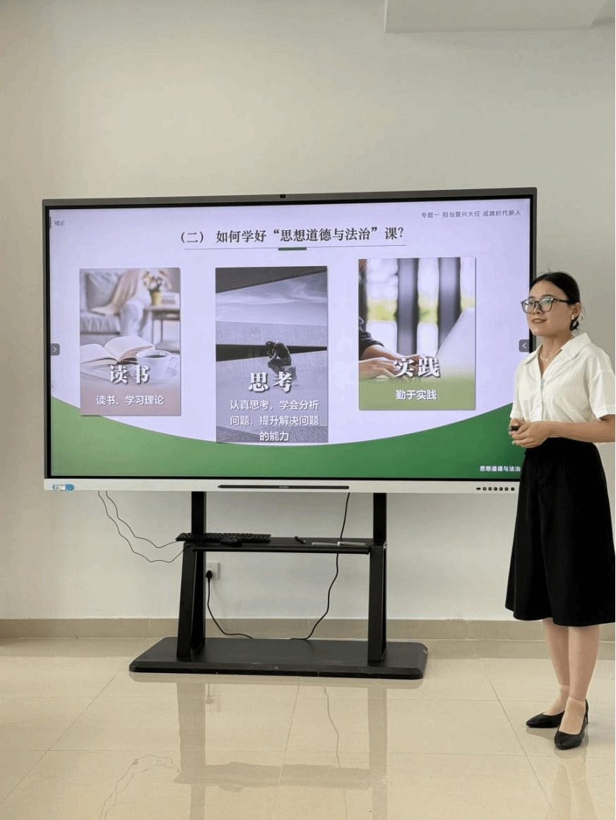 试讲阶段,教师重点分享“如何学好思想道德与法治”的教学思路,提出“多读书、勤思考、勇实践”的学习方法,强调理论与实践结合的重要性。