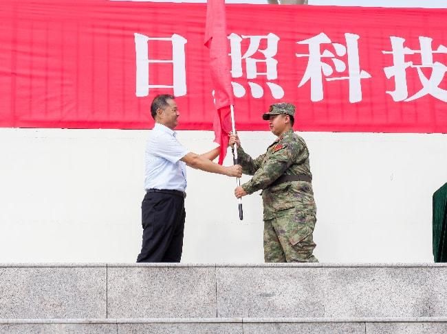 党委书记郭辰夫为军训团团长授军训团团旗。