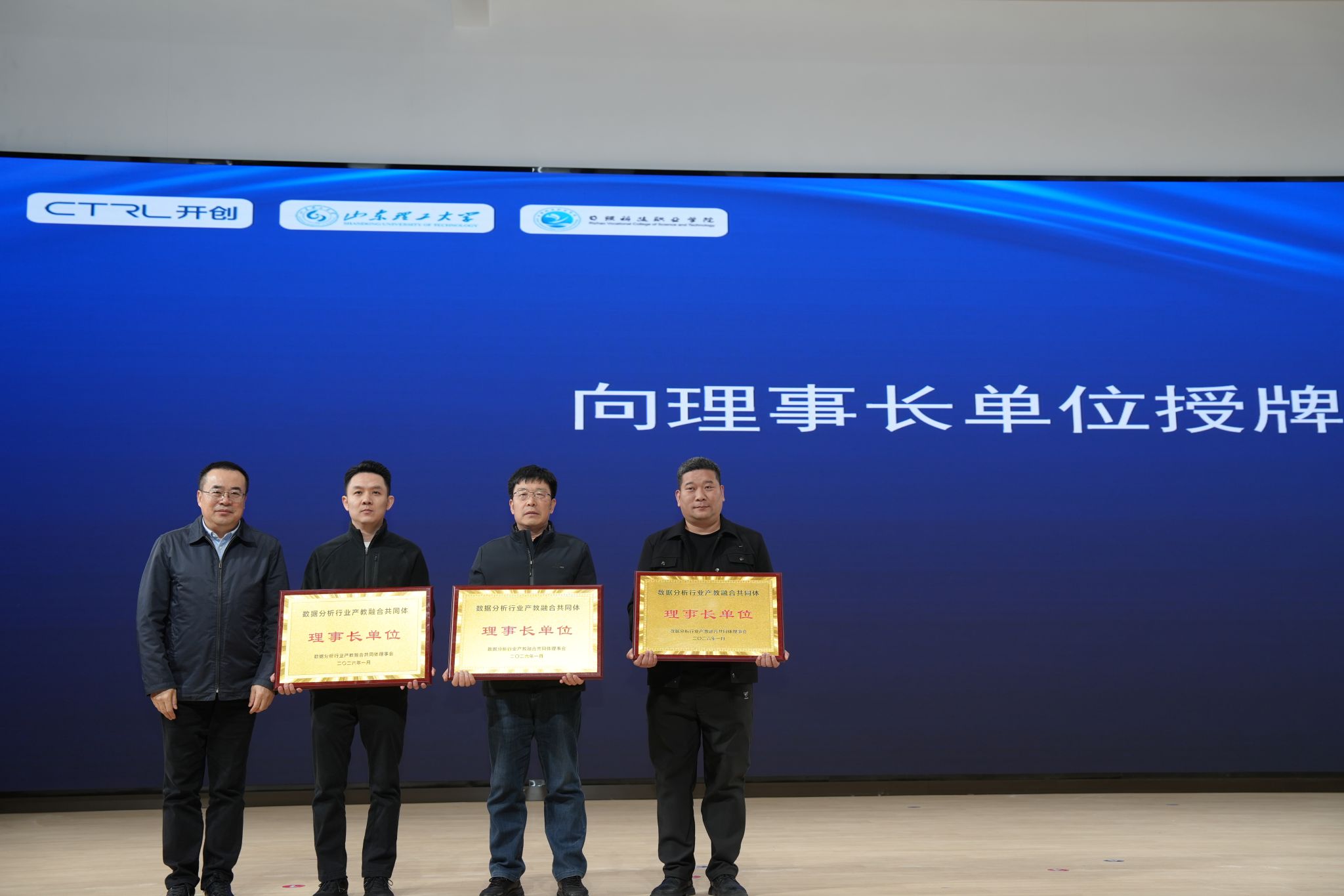 共同体成立大会之前,召开了第一届理事会预备会议,确定山东开创集团股份有限公司、山东理工大学、日照科技职业学院为共同体首届理事长单位,其中日照科技职业学院担任第一届轮值理事长单位。大会选举产生了副理事长单位、秘书长及副秘书长人选,并顺利通过相关决议。在热烈掌声中,与会领导共同为“数据分析行业产教融合共同体”揭牌。杜德昌为三家理事长单位进行了授牌。这标志着由政府、行业、企业、院校多方协同共建的产教融合新平台正式启航,将为数据分析领域的人才培养、技术创新和产业升级提供有力支撑。
