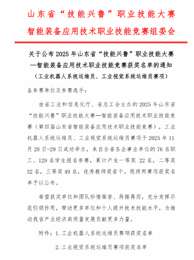 2025年11月28日至30日,2025年山东省“技能兴鲁”职业技能大赛——智能装备应用技术职业技能竞赛(第四届山东省智能装备应用技术职业技能竞赛)圆满落幕。工业机器人技术专业学生孙东林参加工业视觉系统运维员赛项(学生组),荣获二等奖,这是智能制造学院学生参加技能竞赛获奖“零的突破”,充分展现了学生扎实的专业技能与不畏挑战、勇于拼搏的精神风貌。