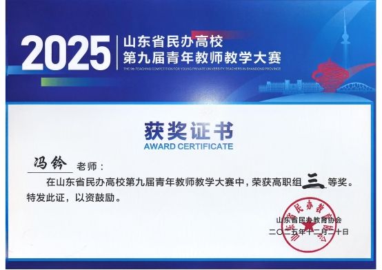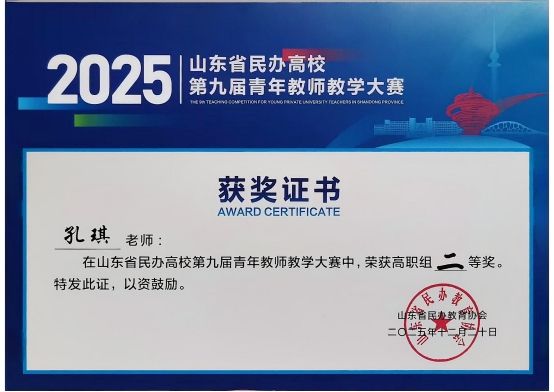 近日,山东省民办高校第九届青年教师教学大赛结果揭晓。我校财经商贸学院教师孔琪、智能制造学院教师冯衿凭借扎实的教学功底、创新的教学设计和出色的现场表现,分别斩获高职组二、三等奖,展现出我校青年教师优秀的教学水平和精神风貌。