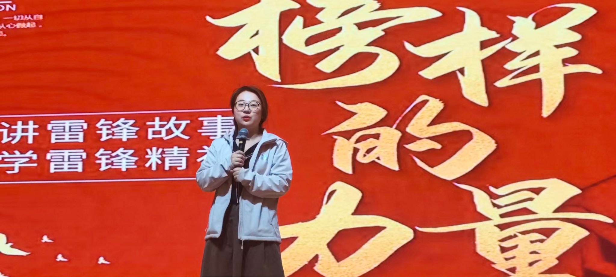 随后,辅导员姚琦老师从志愿服务角度,分享公益与社区服务经历。她提出,新时代雷锋精神是奉献、友爱、互助、进步,号召同学们积极参与志愿活动,以行动展现青年担当。