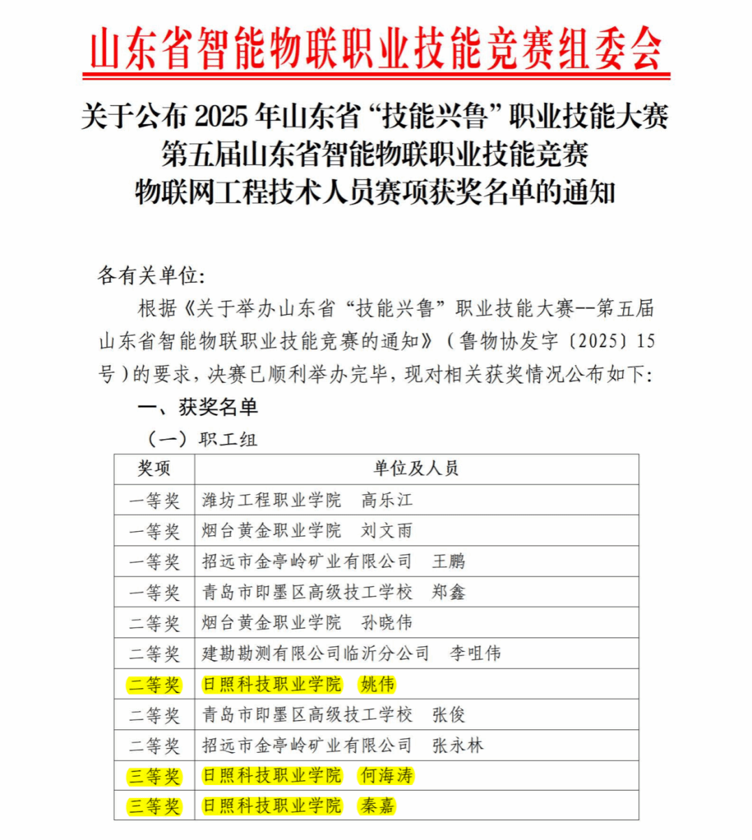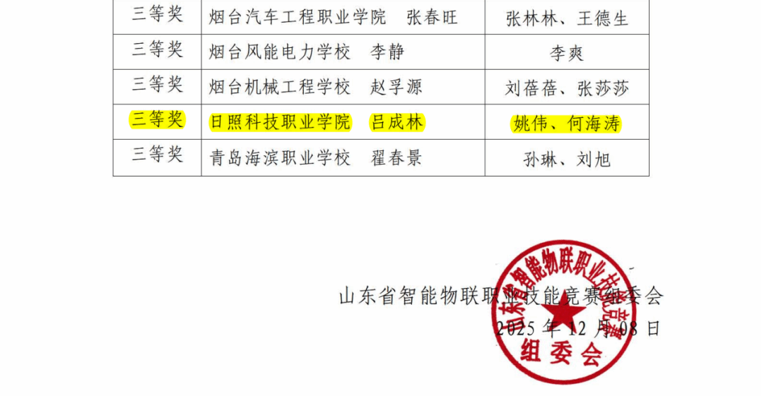 近日,山东省“技能兴鲁”职业技能大赛第五届山东省智能物联职业技能竞赛-物联网工程技术人员赛道成绩正式揭晓。我校师生凭借卓越的专业素养和出色的竞赛表现,在激烈的角逐中脱颖而出,斩获多项荣誉!信息工程学院教师姚伟荣获职工组二等奖,何海涛、秦嘉荣获三等奖,物联网一班吕成林同学荣获学生组三等奖,充分展现出我校在智能物联领域的人才培养实力与师生风采。