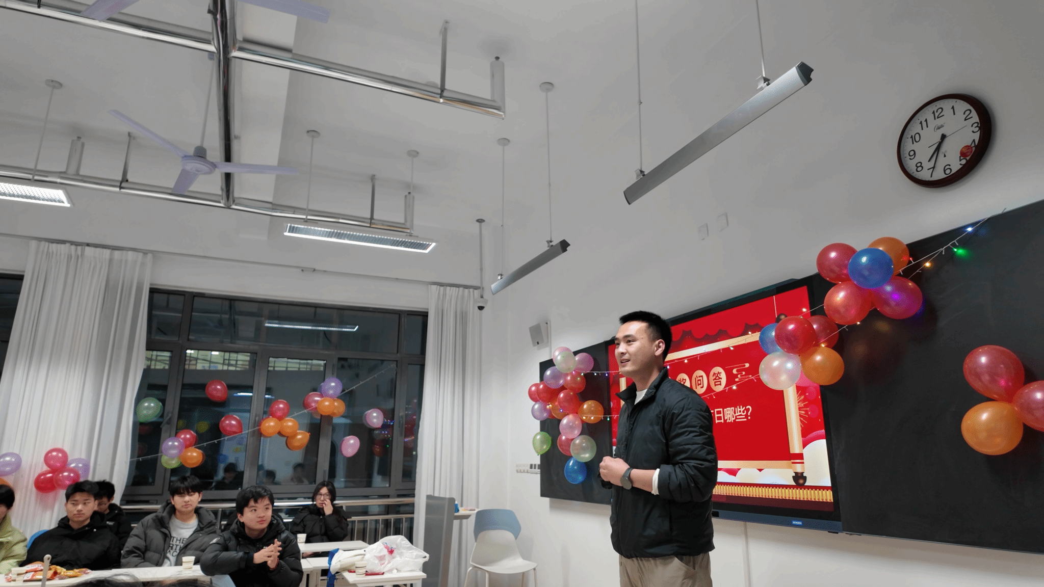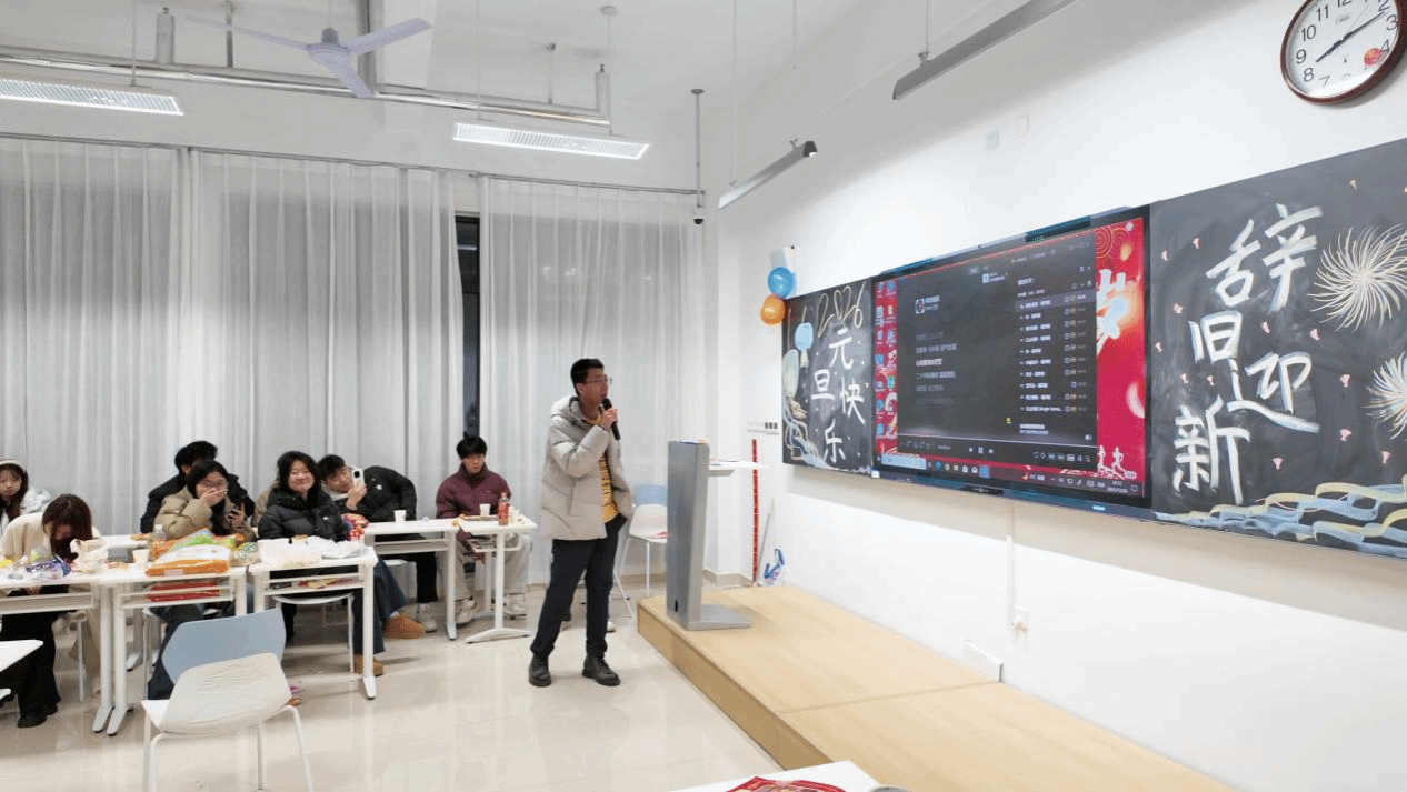 活动现场处处洋溢着欢乐气息,教室被庆祝气球、手绘板报精心装扮。桌上摆放着水果、零食,同学们围坐在一起,或为精彩表演热烈鼓掌,或参与互动游戏开怀大笑,现场掌声、欢笑声此起彼伏。从趣味才艺展示到温馨的新年寄语分享,班主任也为同学们送上歌曲,与同学们共庆元旦。每个班级的联欢活动都各具特色,既展现了信息工程学院学生的青春活力,也让大家在轻松的氛围中感受集体的温暖。