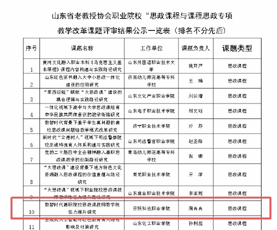 近日,山东省老教授协会公布 2025 年全省职业院校 “思政课程与课程思政” 专项教学改革研究课题评审结果,日照科技职业学院周冉冉老师主持的《数智时代高职院校思政课教师数字胜任力提升研究》课题成功立项,课题类型为 “思政课程”,彰显了学校在思政教育教学改革领域的扎实研究基础与创新实践能力。