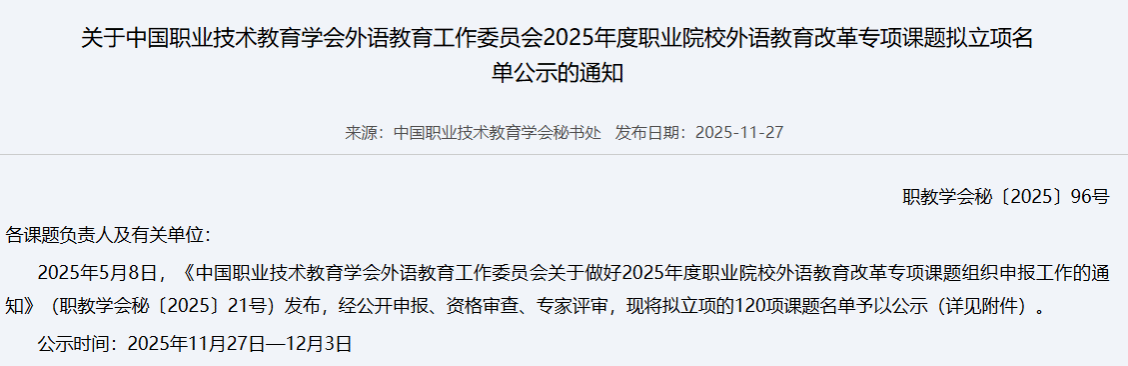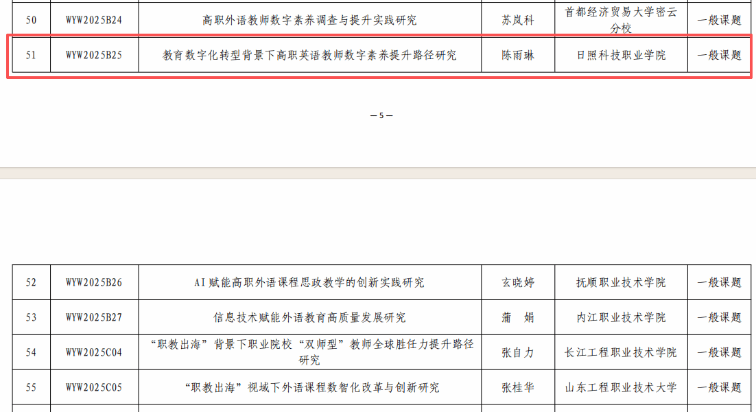 近日,中国职业技术教育学会外语教育工作委员会发布了《2025年度职业院校外语教育改革专项课题拟立项名单公示》。我校科学与人文学院英语教研组陈雨琳老师主持申报的课题,经过公开申报、资格审查、专家评审等严格环节,在全国众多申报项目中脱颖而出,成功获得立项!